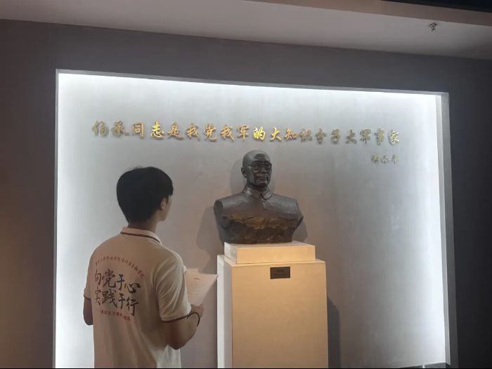 活動(dòng)當(dāng)日,晴空萬(wàn)里,陽(yáng)光灑滿劉伯承紀(jì)念館的青石廣場(chǎng)。兩支團(tuán)隊(duì)成員身著統(tǒng)一實(shí)踐服裝,以整齊隊(duì)列邁著鏗鏘步伐步入館區(qū),神情中飽含對(duì)元帥的深切緬懷與崇高敬意。館內(nèi)陳列的300余件珍貴文物、800余幅歷史圖片及多媒體影像資料,系統(tǒng)勾勒出劉伯承元帥從戎救國(guó)到功勛卓著的壯闊人生軌跡。在講解員的細(xì)致導(dǎo)覽下,同學(xué)們沿著“壯志英華?投身革命”“烽火征程?軍事奇才”“建國(guó)創(chuàng)業(yè)?元帥本色”等展區(qū)依次參觀,透過(guò)泛黃的作戰(zhàn)地圖、磨損的指揮刀、斑駁的軍裝等實(shí)物,真切感受元帥在護(hù)國(guó)戰(zhàn)爭(zhēng)中“獨(dú)眼戰(zhàn)神”的傳奇、長(zhǎng)征路上“彝海結(jié)盟”的智慧、抗日戰(zhàn)場(chǎng)上“神頭嶺伏擊”的謀略,以及建國(guó)后主持軍事教育的開(kāi)拓精神。