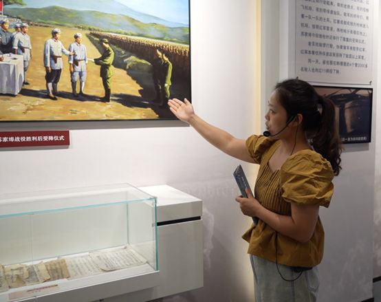 圖為講解員向參觀者介紹蘇家埠戰(zhàn)役勝利后的受降儀式。