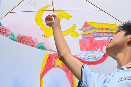 圖為老師牽著做好的天安門風箏準備就緒 農姚 攝