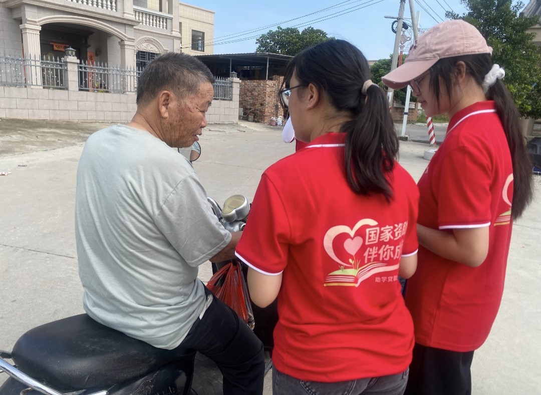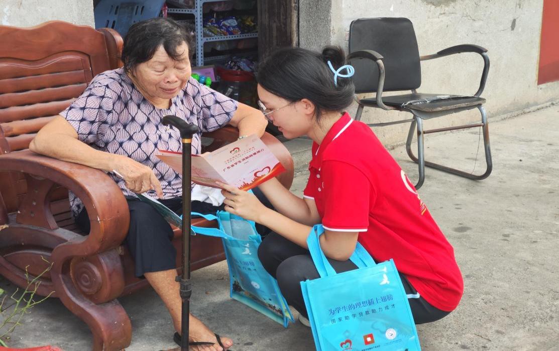 除此之外,隊員們依托田頭圩內主干道這一村民日常出行的重要路徑,開展流動宣講活動。隊員們沿著主干道緩慢行進,通過吆喝資助政策要點,同時隨手配備宣傳資料,向過往村民面對面講解資助范圍、申請條件、辦理流程等內容,讓惠民政策更直接、更便捷地觸達每一位村民。遇到街邊納涼的胡姨,我們主動遞上《廣東省學生自主政策簡介》,簡單講解“獎、貸、助、勤、免、補”等八大資助政策。胡姨表示:“這國家政策好啊,正好我們家里出了兩個大學生,我和他們說啊。”