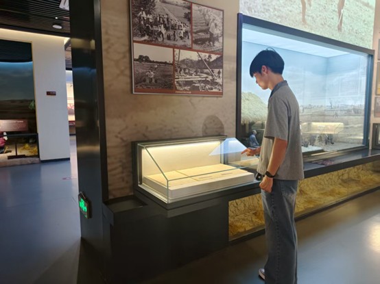 跟隨講解,團隊走進小井莊紀念館。陳列柜里,泛黃的《肥西縣小井莊生產隊包產到戶責任制契約》尤為醒目,紅手印雖歷經歲月,卻依舊力透紙背——這是農民求生存、求發展的樸素決心。墻上照片中,當年村民圍坐討論包產到戶的場景,讓成員們直觀觸摸到歷史的溫度。“原來‘敢為天下先’不是一句口號,是老百姓攥緊鋤頭、賭上生計的勇敢!”團隊成員朱文濤盯著照片,輕聲感慨。