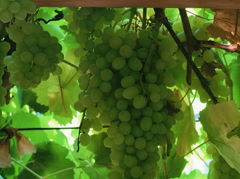 (圖為葡萄溝種植園內成熟的葡萄串,晶瑩剔透的果實掛滿藤架)