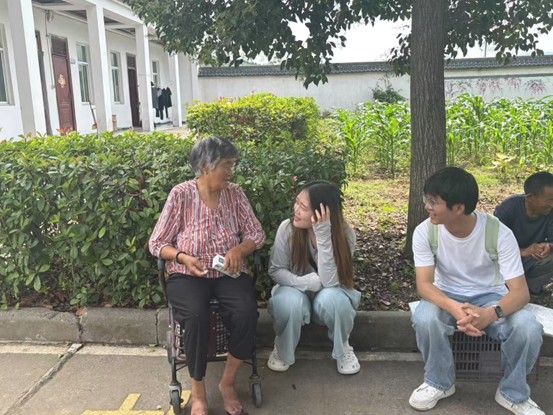 分發完水果后,志愿者們分散在院子各處,與老人們圍坐在一起嘮起了家常。從年輕時的工作經歷到如今的生活起居,從家鄉的變化到院里的日常,老人們打開了話匣子。76 歲的張爺爺興致勃勃地講述著自己種莊稼的往事,志愿者們認真傾聽,時不時點頭回應,偶爾提出問題,讓老人講得更起勁。“平時難得有人聽我說這么多,今天和孩子們聊天,心里敞亮多了。” 張爺爺說。