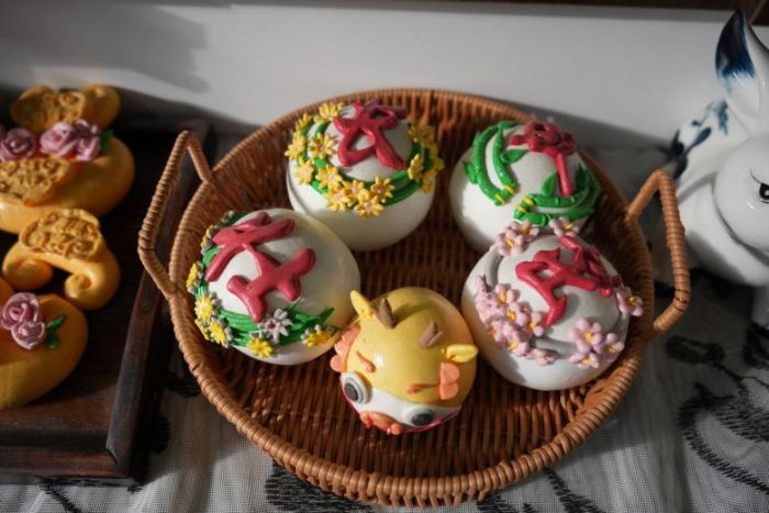 圖3 成品展示在淮北,花饃不僅是食物,更是承載著民俗文化的重要載體。高斯雅深知這份文化重量,卻也懂得用年輕人的語言重新詮釋。她設計的花饃,融入了新中式美學、流行元素,訂婚系列的龍鳳呈祥、端午禮盒里的粽子造型、高考季的“鯉魚躍龍門”,都深受年輕人的喜愛。“年輕人愿意為情緒價值買單,但前提是讓他們覺得,這不僅是饅頭,更是能拿得出手的文化禮物。”高斯雅說。她通過抖音、小紅書等線上平臺分享制作過程,讓更多人了解花饃,也走進了校園、市集,帶著孩子們做簡單的花饃造型,讓這門古老手藝煥發出新的活力。
