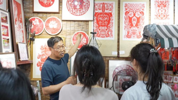 2025年7月16日,淮北師范大學文學院“相城三藝,布韻流芳”非遺傳承實踐團隊踏上了探尋淮北剪紙藝術的旅程。團隊來到濉溪縣石板街,這里不僅是淮北地區重要的商業中心,更是非物質文化遺產的聚集地。在這里,團隊成員們不僅親身體驗了剪紙的魅力,更與宗氏剪紙的第四代傳承人韓學敏進行了一場深入的對話,探尋這門千百年手藝的傳承與發展之路。
