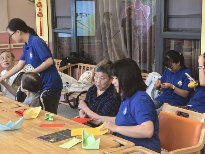 圖為實踐隊員在“巧手折生活”創意折紙工坊中一對一指導老人制作紙鶴。藍晟銘供圖