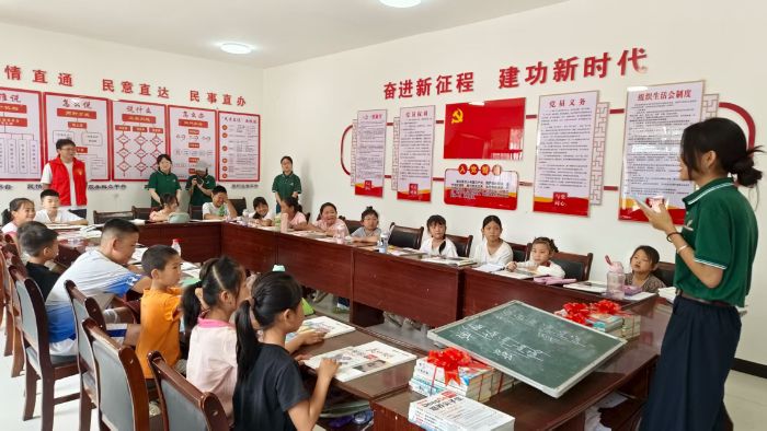 浙江工商大學“推普筑夢,語潤兩當”暑期社會實踐隊隊員在興化鄉暑托班的教學場景