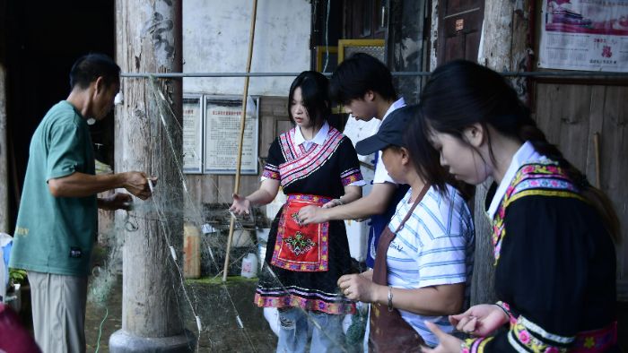來到七里村探花府,師生們對這座畬族古民居的建筑風貌贊嘆不已。精美的木雕、獨特的建筑結構,彰顯了畬族傳統建筑的精湛技藝。在當地村民的講解下,大家聆聽了關于探花府的歷史故事和畬族家族文化,那些塵封的往事仿佛在眼前重現,讓學子們對畬族的家族傳承有了更深刻的理解。師生們走進村民家中,與村民親切交流,了解畬族傳統習俗在現代生活中的傳承情況。從節日慶典到日常禮儀,每一個細節都體現著畬族文化的延續與發展。在村民家中,師生們還開展了志愿服務活動,他們幫助村民摘掉漁網上的垃圾,為菜地澆水,用實際行動為村民們送去溫暖與關懷,這些看似簡單的舉動,卻讓學子們與村民之間建立了深厚的情誼。