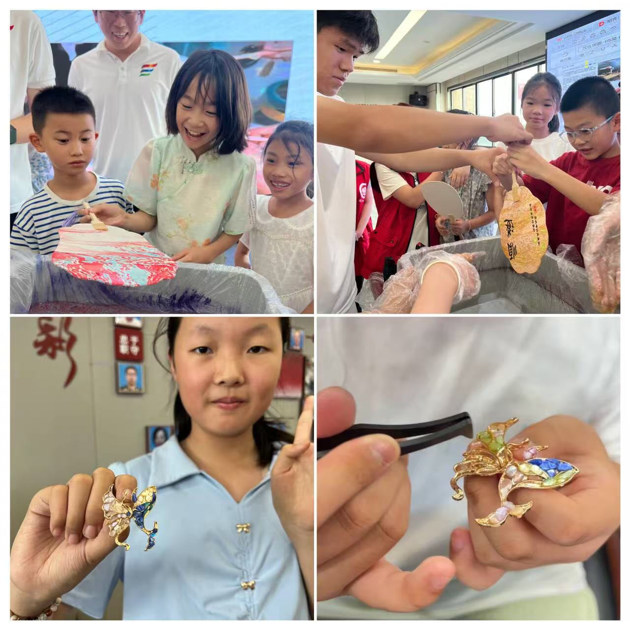 非遺走入社區,童心共繪傳承圖 在南京溧水團山社區,團隊以“理論講解+實踐體驗”的形式開展“大漆與螺鈿”課程。“小小宣講員”周正分享了自己對漆器工藝的感受,孩子們在隊員們的指導下,體驗了漆扇、螺鈿胸針制作。家長們紛紛表示,活動“有趣又有教育意義”。