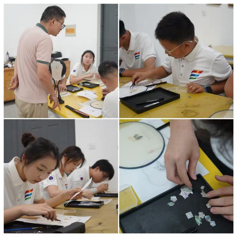 匠心實操潤初心,親身體驗強認同 在揚州漆器廠,隊員們親身體驗了螺鈿漆扇制作。在專業老師的指導下,他們認真完成貝殼切割、圖案鑲嵌等工序。工作人員強調“切割要穩,鑲嵌要準”,讓大家深刻體會到“技在手中,藝在心中”的非遺精魂。通過親手創作,隊員們對這項于2006年列入首批國家級非物質文化遺產的工藝價值,有了更為真切的感悟。