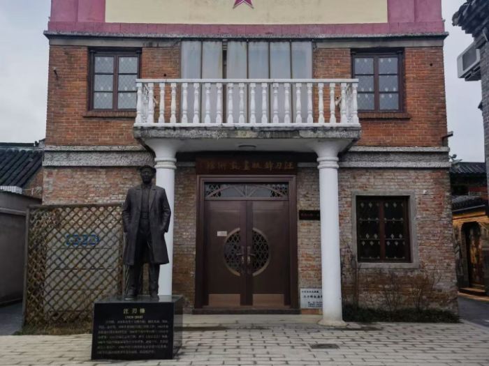 在古鎮內,汪刃鋒版畫藝術館是一處重要的文化場所。藝術館建筑以紅磚墻與白色廊柱為主要特征,門前設有汪刃鋒的雕像,整體呈現出濃厚的人文氣息。團隊成員懷著敬意進入館內參觀。