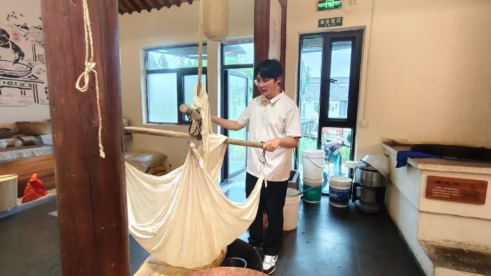 不同于傳統(tǒng)作坊的經(jīng)驗(yàn)化操作,林里豆腐坊的墻壁上繪制著《豆腐古法制作流程圖》,從“選豆—浸泡”到“點(diǎn)鹵—壓制成型”,每一步工序都標(biāo)注著具體細(xì)節(jié)與操作訣竅。團(tuán)隊(duì)觀察到,不少村民和游客會(huì)駐足觀看,孩子們更是圍繞流程圖追問(wèn)工藝原理。“以前做豆腐靠‘手感’,現(xiàn)在有了流程圖,年輕人想學(xué)就有章可循。”豆腐坊孫師傅的話讓團(tuán)隊(duì)深受啟發(fā)。成員們認(rèn)為,這種將隱性經(jīng)驗(yàn)轉(zhuǎn)化為顯性知識(shí)的做法,打破了傳統(tǒng)技藝“傳內(nèi)不傳外、傳男不傳女”的局限,通過(guò)可視化、標(biāo)準(zhǔn)化的呈現(xiàn),讓老手藝更易被年輕一代接受和學(xué)習(xí)。在李師傅的指導(dǎo)下,團(tuán)隊(duì)成員親身體驗(yàn)豆腐制作,更深刻體會(huì)到傳統(tǒng)技藝在現(xiàn)代語(yǔ)境下傳承的必要性與可行性。