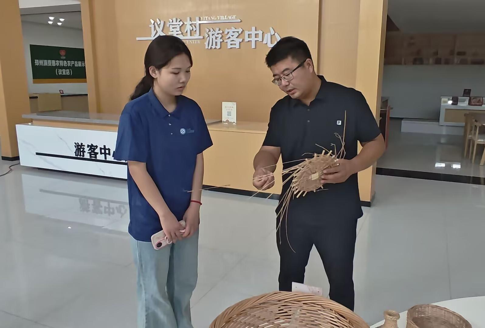 圖為村黨支部書記李坤向實踐團成員介紹柳編產品張山龍攝