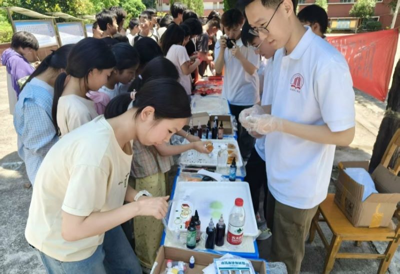 扎染工藝區(qū)則充滿了創(chuàng)意活力。實踐團隊帶來了多種扎染工具,指導(dǎo)同學(xué)們用橡皮筋、夾子等工具在布料上制作紋樣。看著自己親手染制的方巾在陽光下展開,每位同學(xué)臉上都洋溢著成就感。