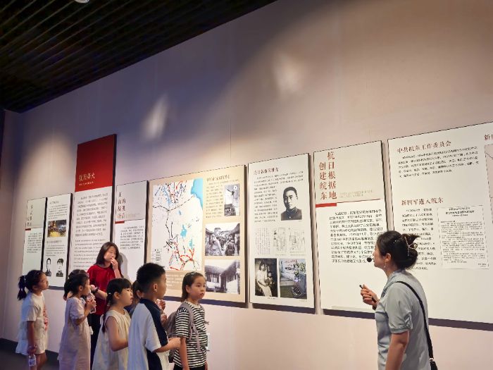 在滁州市博物館,團隊成員與當地小學30余名學生組成“紅色學習小組”,共同聆聽講解員以“皖東烽火”為主題的專題講解。展廳內,一尊尊烈士雕像、一封封泛黃家書、一件件戰爭遺物,將大家帶回那段烽火連天的歲月。講解員生動講述了皖東抗日根據地的建立過程,以及滁州兒女在渡江戰役中“劃著木船送大軍”的感人故事。
