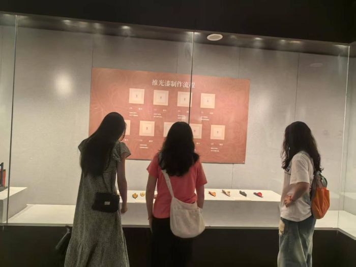 此圖為團隊成員參觀推光漆 張佳怡供圖實踐過程中,隊員們偶遇一位身著“小小講解員”綬帶的小學生,她熱情地為大家介紹了一件漢代俑衣。“這件俑衣的針腳和紋飾,和當時人們穿的衣服一樣!”孩子稚嫩的話語里透著認真,隊員們順著他的指引,從俑衣殘留的布料紋理、褪色的紋飾中,推測漢代紡織工藝與審美取向,一場偶然的交流,讓文物背后的故事更添溫度。