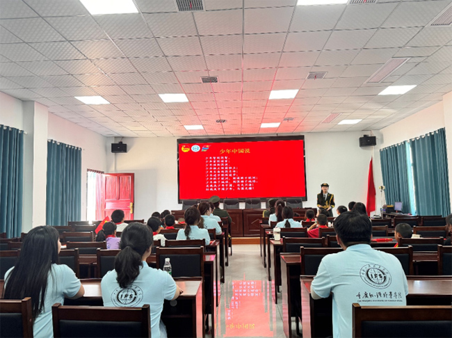 接著,隊員們帶領孩子們朗誦《少年中國說》。“少年智則國智,少年富則國富;少年強則國強,少年獨立則國獨立……”激昂的朗誦聲在教室里回蕩,孩子們的聲音雖然稚嫩,但卻充滿了力量,展現出新時代少年的蓬勃朝氣和對祖國未來的美好憧憬。