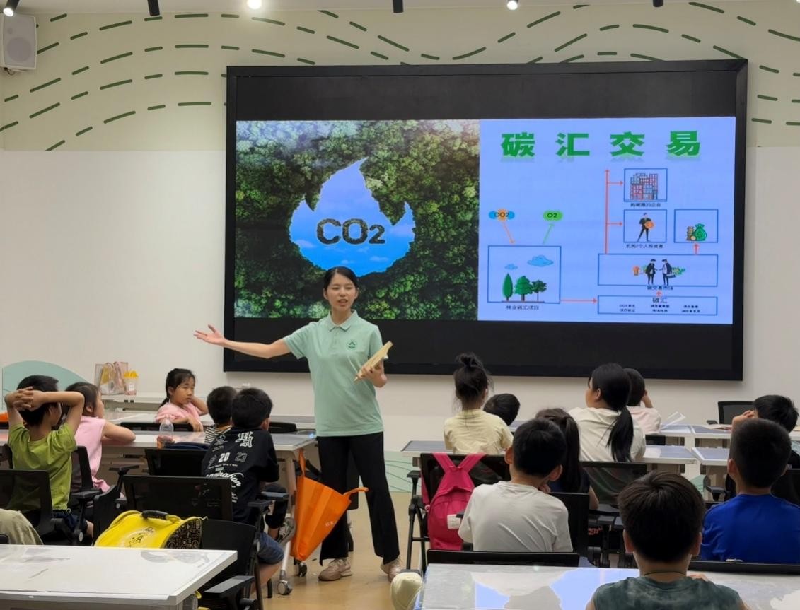 實踐團成員身著綠色文化衫,手持《竹譜詳錄》古籍復刻本走上講臺,屏幕上“綠水青山就是金山銀山”的竹海背景瞬間點亮孩子們的目光。首先,實踐團成員以鄭燮《竹石》為引,用動畫演示竹子扎根破巖的生長周期,結合小古城村茶山生態,講解浙農林大茶學專業如何用科技守護“一片葉子”;隨后,實踐團用“全球首座竹林碳通量塔”模型演示碳匯監測原理,結合“碳匯交易”動畫,把專業知識轉化為趣味故事,引起小朋友們的一片驚呼;最動人的環節,是“竹夢明信片”互動。孩子們用彩筆描繪心中的“竹科技”。這場45分鐘的課堂,不僅是知識傳遞,更是青春火種的播撒——當小古城的孩子把大學夢種進心底,鄉村振興的人才接力,已悄然開啟新篇。