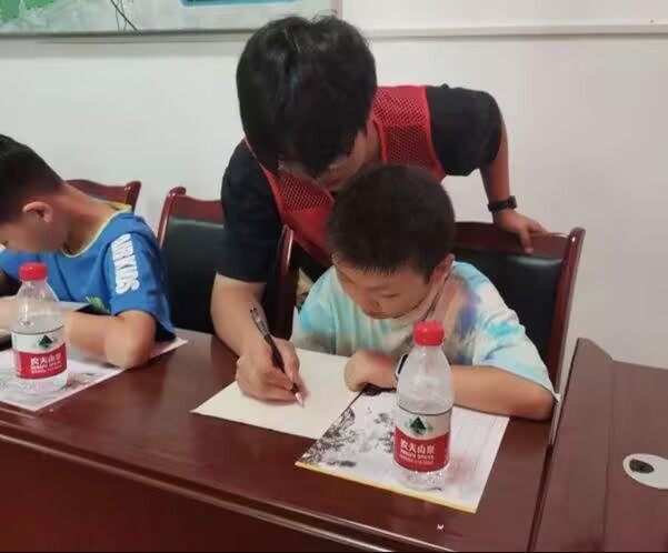 志愿者正在輔導(dǎo)小學(xué)生完成暑假作業(yè)