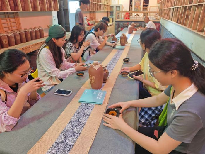 為深入挖掘濉溪茶文化的千年脈絡,調研團特別策劃了茶文化專題調研活動。7月1日至7月4日期間,團隊成員通過實地走訪、非遺傳承人訪談、技藝體驗等多種形式,全方位感受了濉溪茶文化的獨特魅力。在古鎮保存完好的茶行舊址與古茶道間,隊員們觸摸到了明清時期茶貿易的繁榮印記。當地文史專家詳細講解了濉溪茶文化的發展歷程,尤其是“淮北茶道”在南北商貿交流中的獨特地位,讓師生們對濉溪茶文化有了更深入的了解。7月3日清晨,調研團來到濉溪老街的“王家茶坊”,親身體驗了當地特有的“棒棒茶”品飲儀式。棒棒茶,這一皖北古韻中的非遺茶飲傳奇,于2008年被列入安徽省非物質文化遺產名錄,其起源可追溯至宋元時期臨渙古鎮的飲茶習俗,真正形成獨特體系則是在明清時期。同學們按照老茶人指導的“三聞三品”古禮,細細品味茶湯的滋味變化,感受“七分茶三分棒”的絕妙配比,從老茶人講述的茶禮掌故中,領略到了非遺文化的獨特魅力。