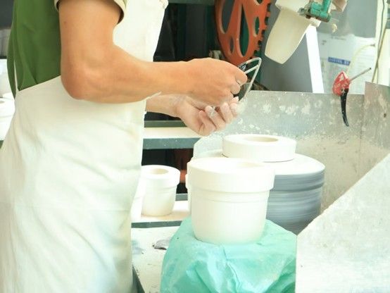 在生產一線,實踐隊員系統觀摩了陶瓷成型、加工、裝飾等生產環節。從滾壓成型、修坯精磨、手工施釉等一系列步驟可見,每道工序既保留了德化陶瓷的精湛工藝底蘊,又融入了現代生產的高效理念。尤其在胚體成型環節,工人運用機器壓胚技術替代人工完成揉泥、拉制、修整等多道工序,較傳統手工拉胚效率實現質的飛躍。此外,工廠在保障高效生產的同時,并未忽視個性化需求,可根據客戶需求開展手工繪畫、貼花等個性化加工,既保留了德化陶瓷的藝術質感,又展現出柔性化生產的靈活優勢,有效平衡了規模化生產與定制化需求。