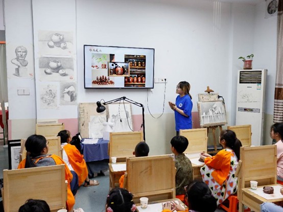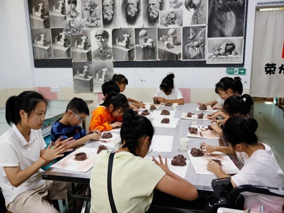 圖為實踐隊成員與榮州書畫培訓(xùn)學(xué)校新城分校的小朋友們共同完成土陶作品。楊欣霖供圖