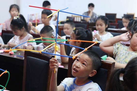 圖為實踐隊成員和小朋友們在課堂上專注地玩吸管積木。楊欣霖 供圖