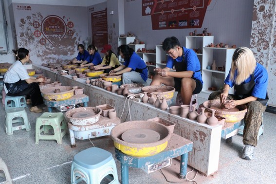 圖為團隊成員在榮縣土陶創(chuàng)意園進行制陶體驗。肖云杰供圖
