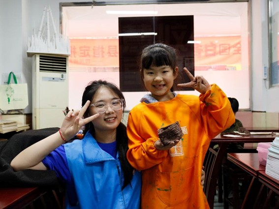 圖為實踐隊成員與榮州書畫培訓學校新城分校的小朋友們共同完成土陶作品。楊欣霖供圖