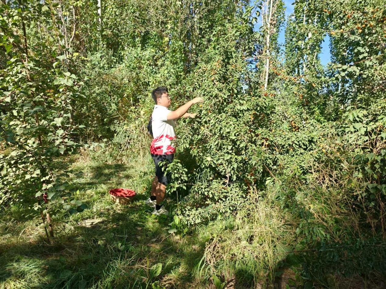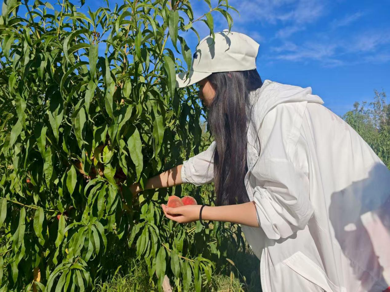 實踐期間,恰逢小白杏與血桃的成熟采收季。在農場技術人員的專業指導下,實踐團成員深入果園,學習并參與了果實的采摘工作。從枝頭摘下飽滿的小白杏與緋紅的血桃,隊員們親身體驗了豐收的喜悅,更深刻感受到每一顆甘甜果實都凝結著果農日復一日的辛勤勞作與精心管護。