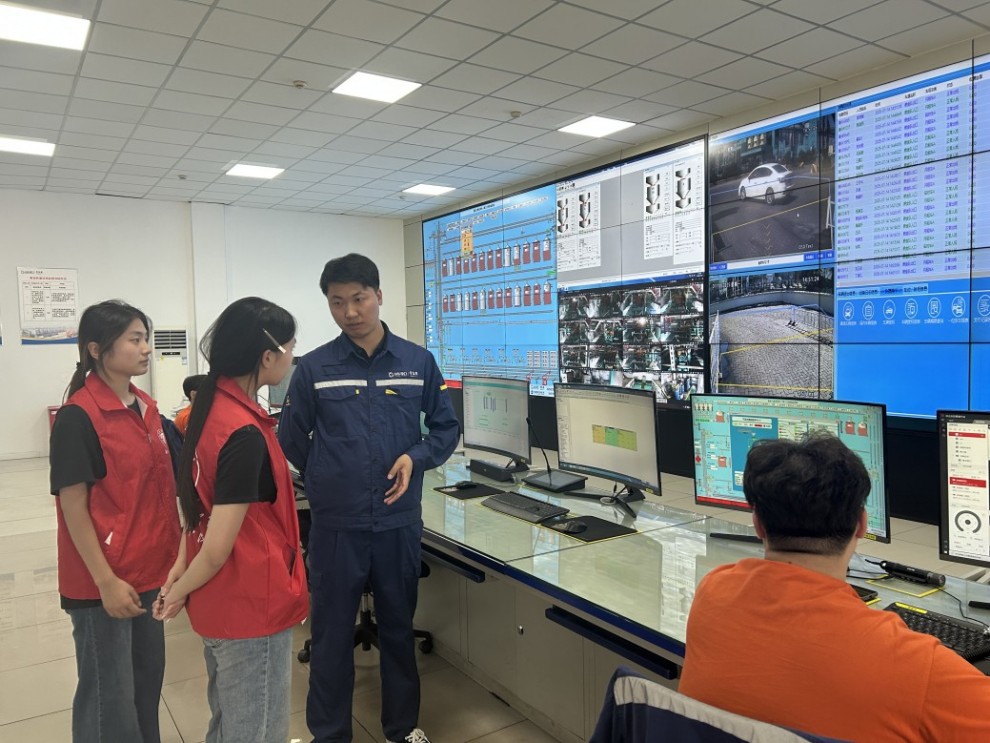 “傳統礦石碼頭常被戲稱‘晴天一身灰,雨天一身泥’,但在這里,我們把粉塵鎖在了‘籠子里’。”沿著參觀通道前行,團隊成員被眼前的景象吸引:巨型卸船機作業區被全封閉罩嚴密封鎖,礦石從貨輪卸出后直接進入密閉輸送廊道,廊道內降塵設備持續運轉,全程不見粉塵外溢。這些設施如綠色屏障,將污染牢牢控制,展現著碼頭在綠色發展上的決心。從全封閉輸送系統到新能源車輛的廣泛應用,每一項舉措都體現著對環保的重視。通過實地觀察與互動,團隊成員對綠色港口建設的具體路徑有了更深入地理解,真切體會到科技賦能綠色發展的生動實踐。
