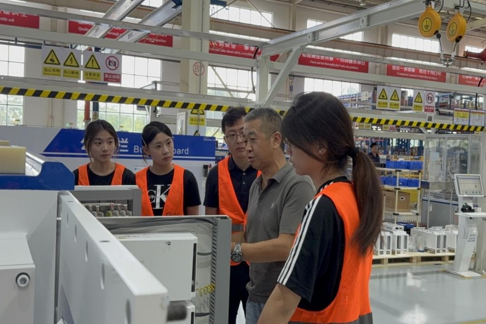 實踐團隊前往港口工業園區內的一家企業。在生產車間,實踐隊員與企業環保部負責人交流,詢問屋頂光伏板矩陣與儲能系統的運行情況,了解清潔能源在生產中的應用占比等信息;同時,實踐隊員還關注到企業在產品設計階段融入的低碳理念。這些從負責人講解中獲取的內容,讓隊員們對企業節能有了直觀感受,也激發了實踐團隊對 “微觀節能” 與 “宏觀減排”關聯的思考。