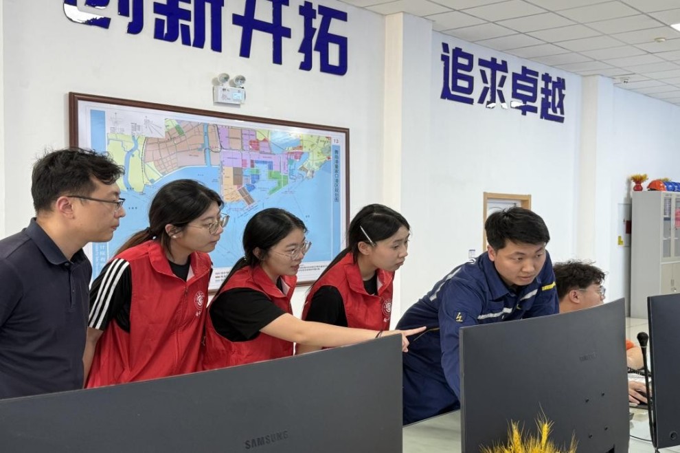 實踐隊員在青島港中控室與負責人進行交流。閆泓霖攝