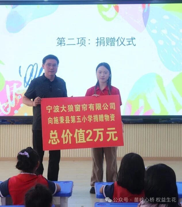 在隨后舉行的捐贈儀式上,寧波市尤耐克有限公司和寧波大狼窗飾有限公司分別向學校捐贈了價值2.5萬元和2萬元的教學物資,這些物資將用于改善學校的辦學條件。校方代表與實踐隊共同完成了捐贈物資的交接工作。