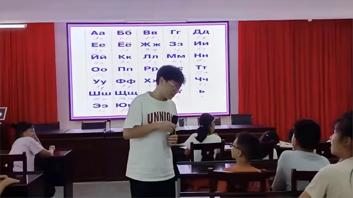 隨后,志愿者方子恒老師以一種循序漸進(jìn)的方式,從俄語字母的基礎(chǔ)開始,逐步深入到俄語單詞的層面,細(xì)致地講解了每一個字母的發(fā)音和書寫規(guī)則,以及如何將這些字母組合成有意義的單詞。他耐心地引導(dǎo)同學(xué)們掌握每一個細(xì)節(jié),確保他們能夠正確地理解和運(yùn)用這些基礎(chǔ)知識。通過反復(fù)多次的領(lǐng)讀,同學(xué)們逐步熟悉再到掌握字母和單詞的音與形,同學(xué)們在發(fā)音上和拼寫上有了顯著的提高,朗讀時也變得更加自信。