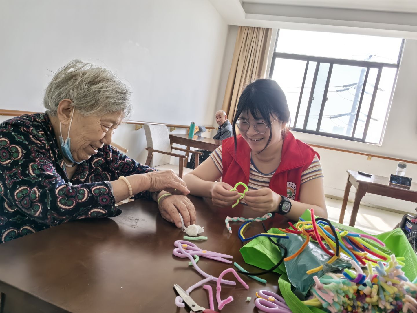 失智專區(qū)組針對認知障礙老人設計專屬服務。志愿者以色彩鮮艷的扭扭棒為載體,引導老人進行手工創(chuàng)作:協(xié)助挑選顏色、指導拼接造型,在動手過程中鍛煉手部控制能力與思維能力。志愿者還播放經典戲曲視頻,帶領老人聆聽曲目,借熟悉旋律喚起記憶共鳴,在趣味互動中為失智老人營造安心的氛圍。