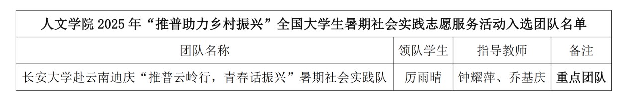 教育部公布了2025年“推普助力鄉村振興”全國大學生暑期社會實踐志愿服務活動入選團隊名單。根據《關于開展2025年“推普助力鄉村振興”全國大學生暑期社會實踐志愿服務活動的通知》相關要求,全國各高校師生積極參與、踴躍報名,共有1680所高校的8013支團隊8萬余名師生報名。經委托相關國家語言文字推廣基地組織專家審議,推薦1000支團隊入選重點團隊、1000支團隊入選參與協同團隊。長安大學人文學院1支團隊入選重點團隊。